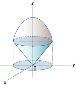 Исследуем сначала пересечение двух заданных поверхностей. Приравнивая координаты \(z,\) получаем уравнение \[2 - {x^2} - {y^2} = \sqrt {{x^2} + {y^2}} .\] Пусть \({x^2} + {y^2} = {t^2}.\) Тогда \[ {2 - {t^2} = t,}\;\; {\Rightarrow {t^2} + t - 2 = 0,}\;\; {\Rightarrow {t_{1,2}} = \frac{{ - 1 \pm 3}}{2} = - 2;1.} \] В контексте данной задачи смысл имеет лишь корень \(t = 1,\) то есть \[ {z = \sqrt {{x^2} + {y^2}} = 1}\;\; {\text{или}\;\;{x^2} + {y^2} = 1.} \] Итак, обе поверхности пересекаются при \(z = 1,\) и сечение представляет собой круг (рисунок \(10\)).