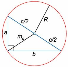\({m_c} = \large\frac{c}{2}\normalsize\), где \({m_c}\) − медиана, опущенная из прямого угла на гипотенузу \(c\).