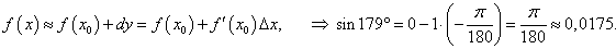 Пусть x = 179°, x0 = 180°. Следовательно, Δx = x − x0 = 179° − 180° = −1° = − π/180 радиан. Вычислим значение функции и ее производной в точке x0: