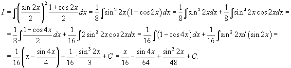 Делая замену u = cos x, du = − sin xdx и выражая синус через косинус с помощью формулы  , получаем