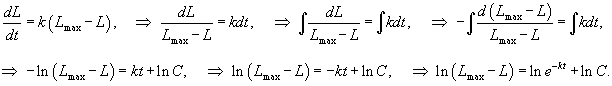 k − коэффициент пропорциональности. Данное дифференциальное уравнение является уравнением с разделяющимися переменными, и его легко можно решить в общем виде: