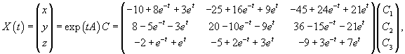 где C = (C1, C2, ..., Cn) T − произвольный n-мерный вектор. Символ T обозначает операцию транспонирования. В этой формуле мы не можем записать вектор C перед матричной экспонентой, поскольку произведение матриц  не определено.